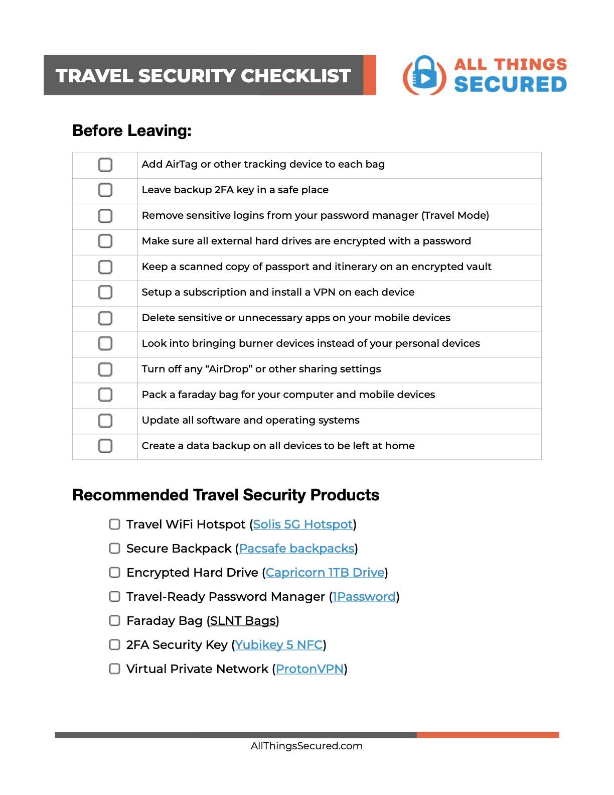 This checklist from All Things Secured is particularly useful for international travelers and business travelers who need to confirm that they've taken the necessary steps to secure their sensitive data.